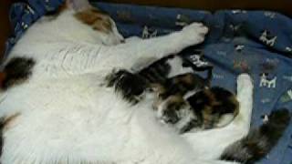 De boerin vertelde dat het kittens van 2 moeders waren, met 1,5 week ertussen. De zwarte poes, met heel zwakke longen, had haar nestje van 2 kittens gebaard naast de kittens van de rode poes, en samen zorgden ze nu voor de kittens. De zwarte poes is erg zwak, de rode zoogt dus ook de zwarte kittens en verzorgt hen goed. Ik moest gelijk aan dit draadje denken en wilde jullie dit prachtige wonder der natuur niet onthouden!