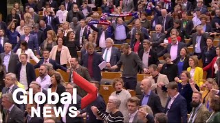 https://www.youtube.com/watch?v=OwC1E6TH0f8Het Europese Parlement barst uit in het zingen van Auld Lang Syne na de uitslag van de stemming over het uittreden van de UK.