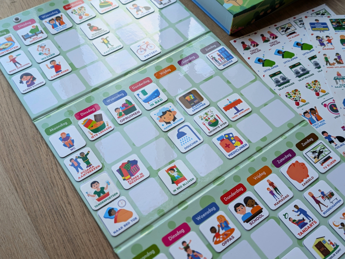 Elke week mogen ze samen de planner vullen met de vrolijke, magnetische pictogrammen voor hun taken die ze in de ochtend en avond moeten doen. Tandenpoetsen, aankleden, haren kammen, tas inpakken, schoenen aantrekken, pyjama aan: echt elke activiteit heeft een magneetje in dit pakket. Zelfs onze jongste, die nog niet kan lezen, begrijpt precies wat er op het bord staat.